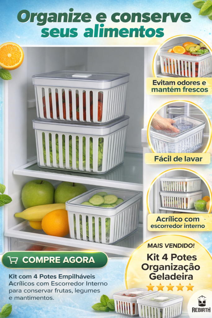 Utilizando o organizador, você garante que seus alimentos durem mais tempo sem estragar, mantendo a qualidade e o frescor por mais tempo. Seu recipiente foi projetado para otimizar o espaço, permitindo empilhar os itens e mantendo tudo acessível. Além disso, possui um cesto de drenagem que favorece a circulação de ar, controla a umidade e remove os gases produzidos pelos alimentos, evitando a decomposição precoce.